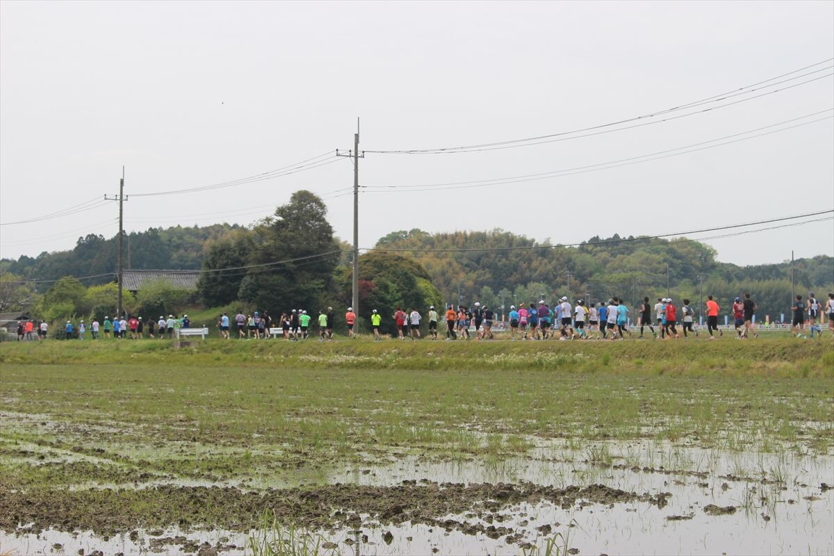 20244月24 かすみがうらマラソン かすみがうらマラソン兼国際ブラインドマラソン2024では一般の部とブラインドマラソンの部があり、それぞれフルマラソン(42.195キロ)、10マイル(16.09キロ)、5キロの3クラスに分かれます。いずれも男女別です。各クラス総勢1万3575人がエントリーしたそうです。水田の中を走る。