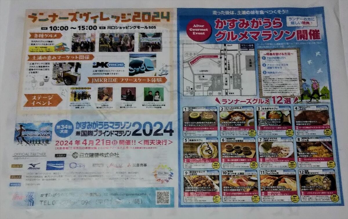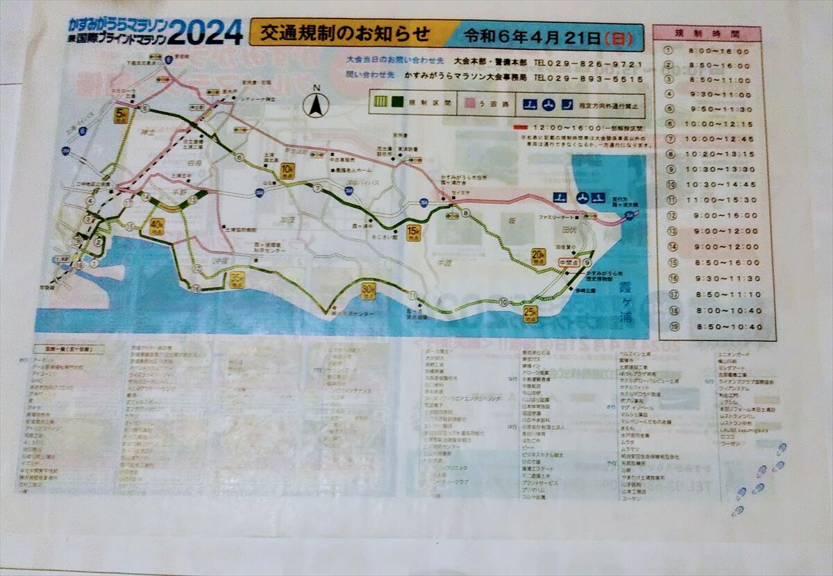 20244月18 かすみがうらマラソン 毎年恒例の「かすみがうらマラソン」が4月21日に開催されます。近くのコースがのぼり旗で飾られました。この近くに中間点があります。⑨のここは、10時30分から13時30分まで交通規制がかけられています。旗が立てられました。かすみがうらマラソンの案内。